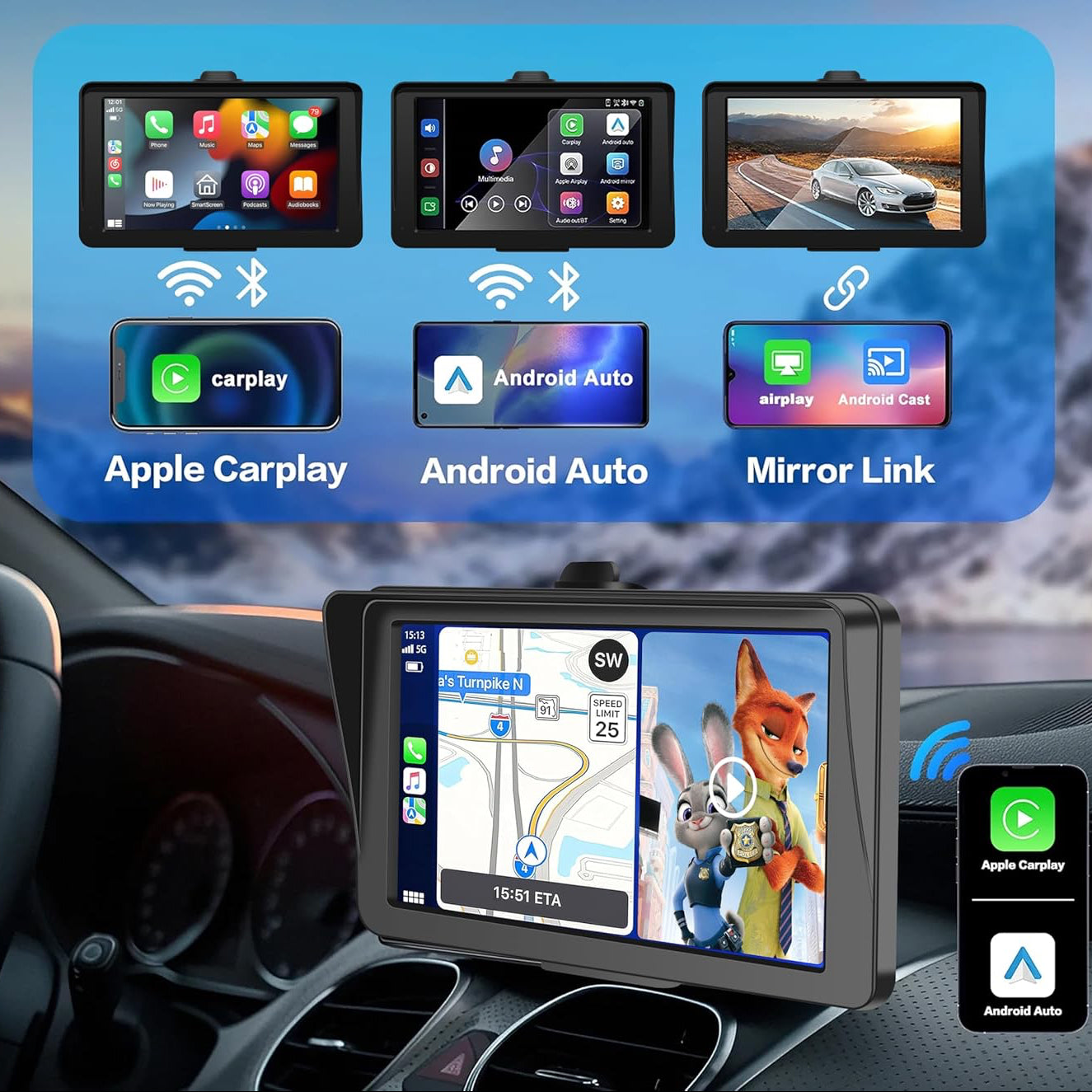 Erleben SieCarPlay und Android Auto ohne lästige Kabel. Einfach verbinden, automatisch wiederherstellen und direkt losfahren. Musik, Navigation, Anrufe und Apps stehenstets stabil und schnellzur Verfügung – für ein komfortables, sorgenfreies Fahrerlebnis.